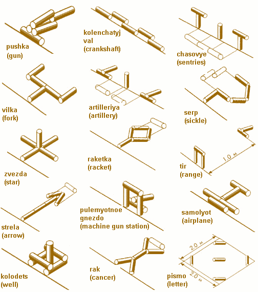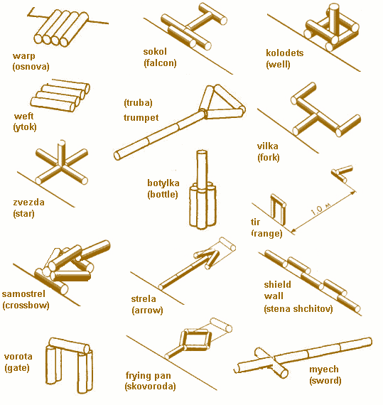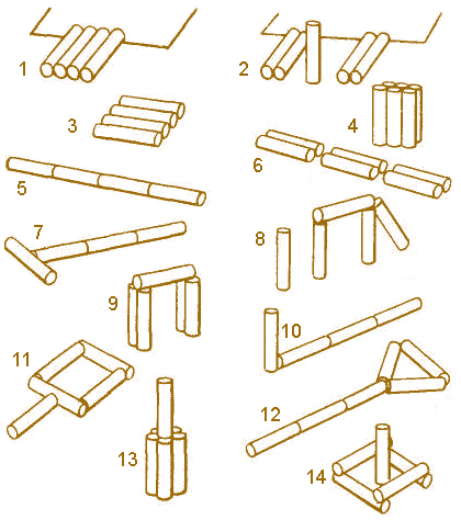 1. Плашмя, одна рюха около другой. (Lying down next to each other) 2. Плашмя, одна рюха стоит. (Lying down with the one middle standing) 3. Рюхи лежат боковой поверхностью вперед. (Lying down next to each other the other direction) 4. Рюхи стоят в два ряда.(Standing in 2 rows) 5. По одной. (Lying end to end) 6. Парами. (Lying in pairs) 7. Фигура «Гвоздь». (The "nail") 8. Фигура «Слон». (The "elephant") 9. Фигура «Ворота». (The "gate") 10. Фигура «Поезд». (The "train") 11. Фигура «Колотушка». (The "clapper") 12. Фигура «Фонарь». (The "lamp") 13. Фигура «Бутылка». (The "bottle") 14. Фигура «Колодец». (The "well") |