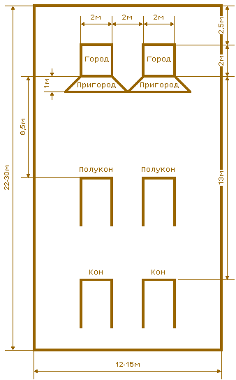 The main throwing line (kon) is 42.6 feet (13m) from the city. Another throwing line (polukon) is 21.3 feet (6.5m) from the city, halfway between the city and the kon.