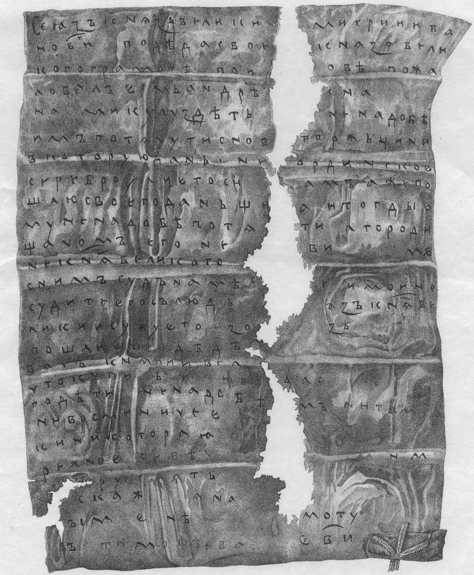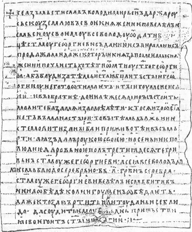 се азъ мьстиславъ володимирь сынъ дьржа роусьскоу землю въ свое княжение повелелъ есмь сыноу своемоу всеволодоу отдати боуице святомоу георгиеви съ данию и съ вирами и съ продажами /и вено вотское/ даже которыи князь по моемъ княжении почьнеть хотети от'яти оу святого георгия .