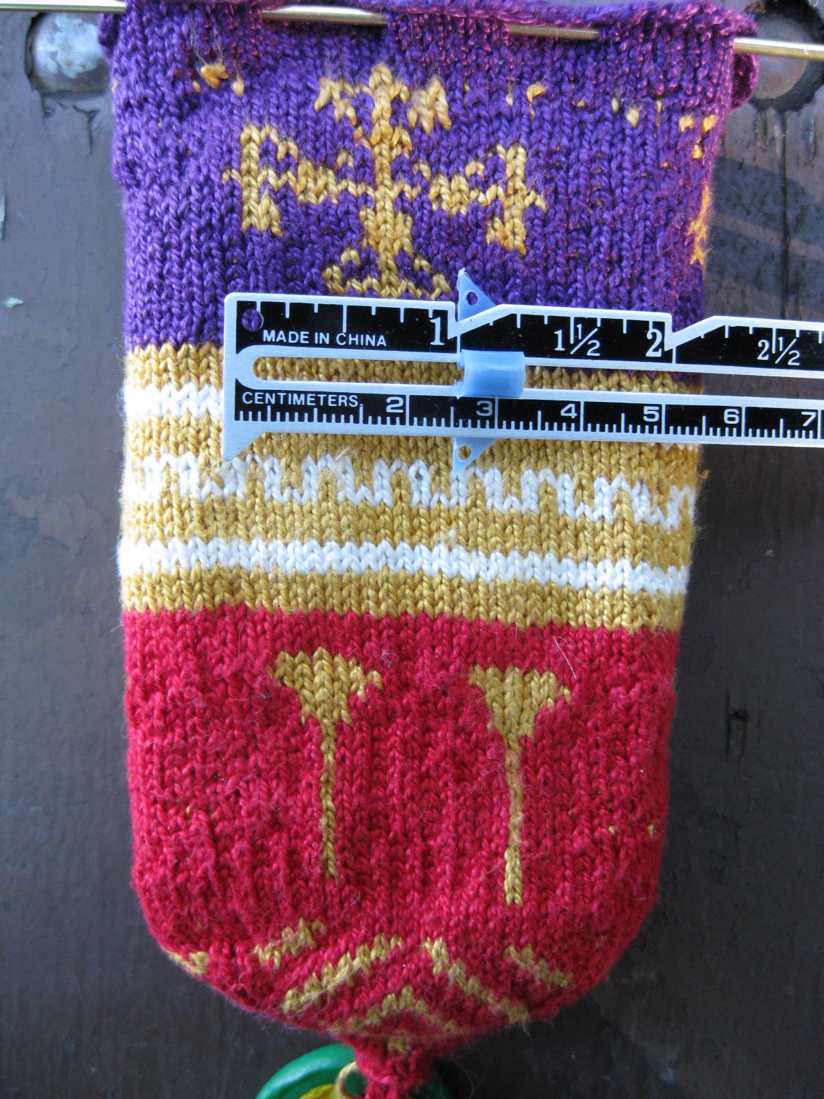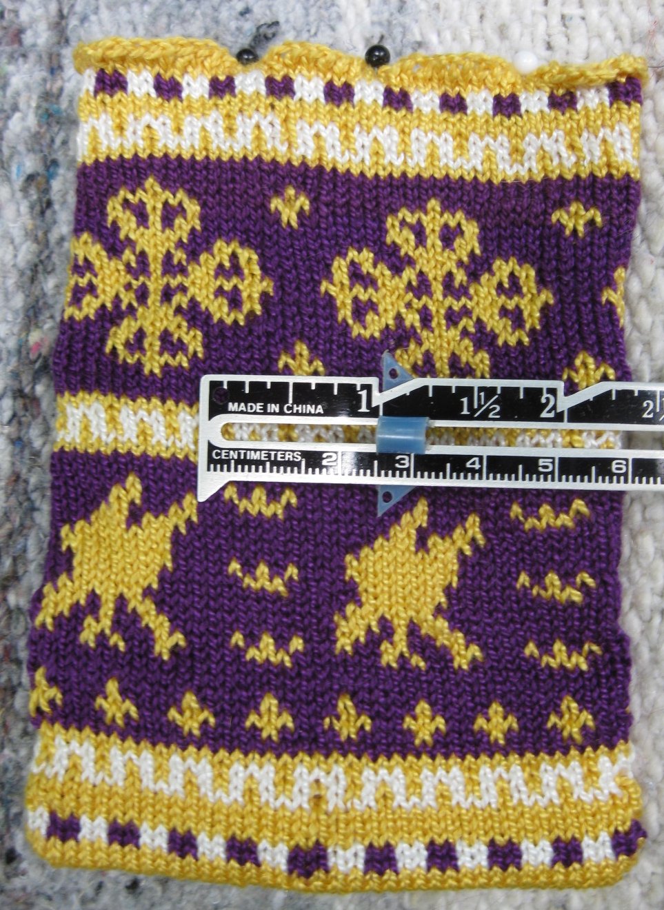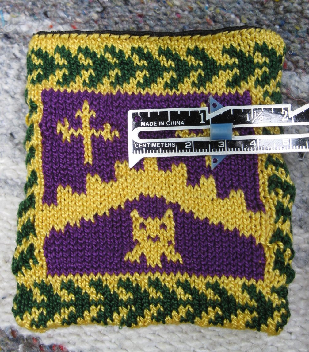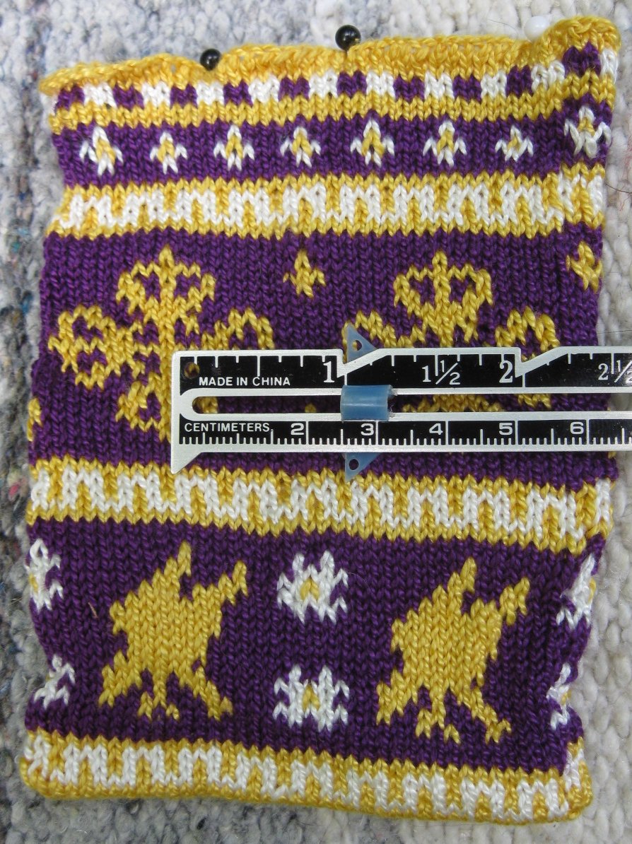 Notes: I'm still not happy with the vertical laurel wreaths but they turned out better than Christian's pouch. This time I just stranded the thread across the back of the vertical stripe when it was time to knit the next row (instead of trying to purl back across). Keeping the tension right for that was difficult. I should have done one more row of gold at the bottom before I did the "inside-out invisible Russian cast-off".