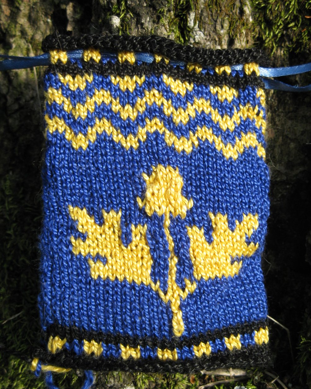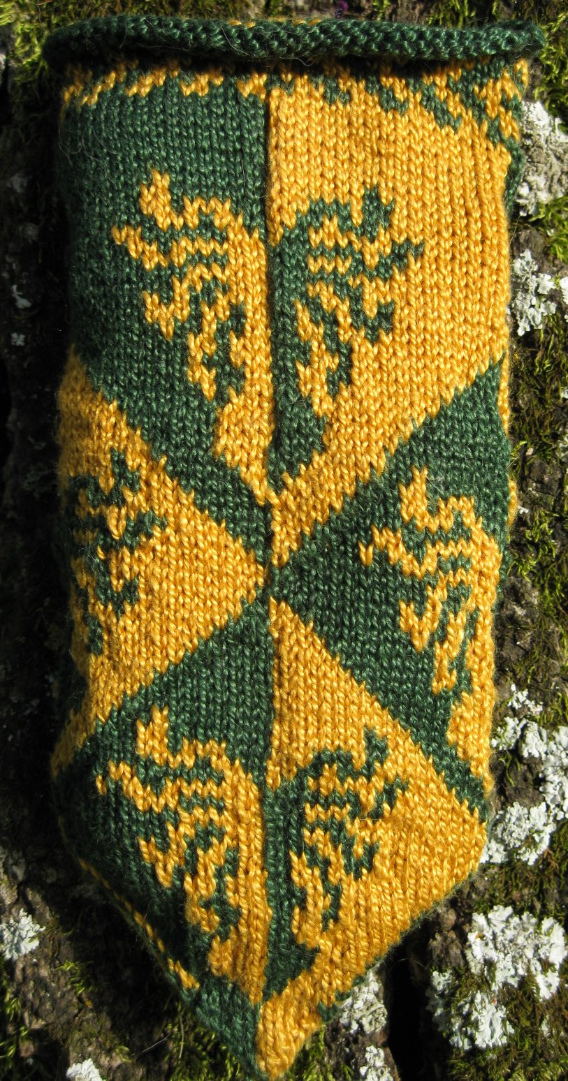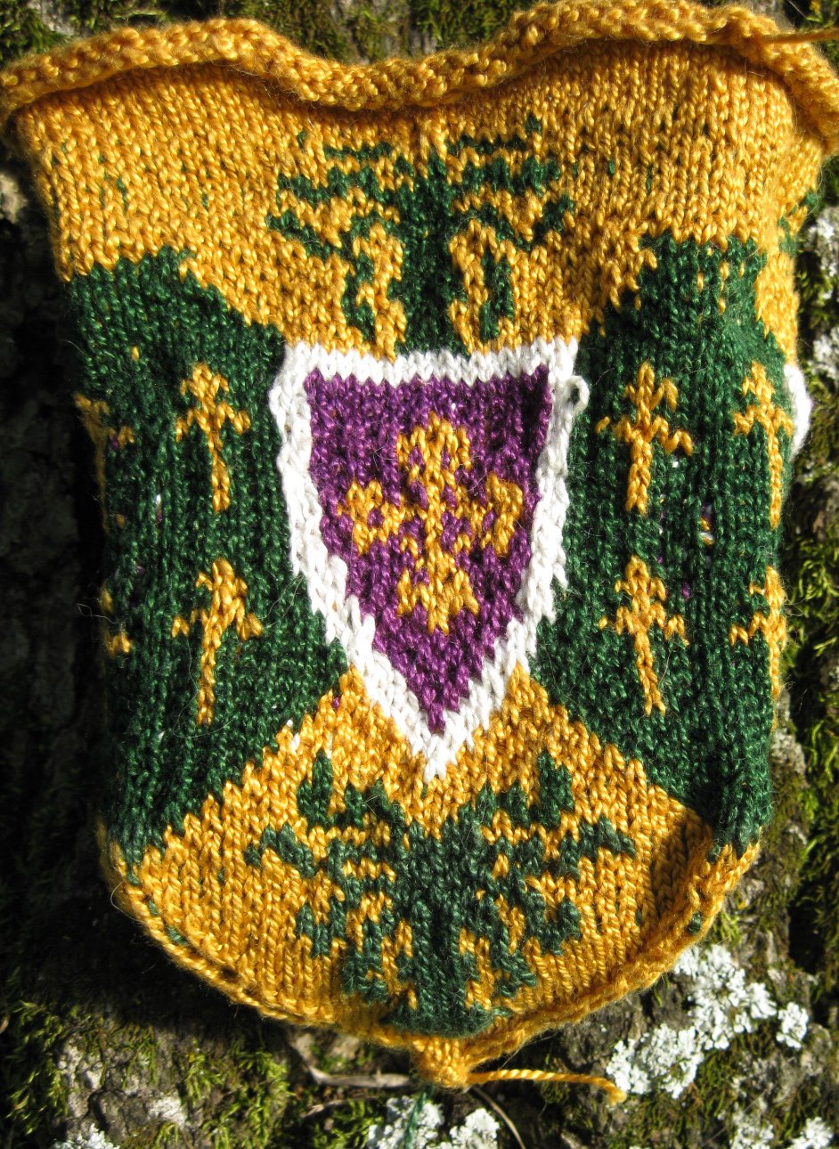 Notes: knitted from the top down to improve the appearance of the mini fleur-de-lis and incorporated other pattern changes learned from Calontir Pouch above. It was stranded with background color in my right "throwing" hand and pattern color in my left "picking" hand since my left hand knits a little more loosely which makes the pattern stitches show better. I used a Russian-style cast-off technique () to knit the bottom of the pouch closed from the inside for a very tidy finish. If I could just get my cast-on to be as nice! This was the first stranded project that I've done that didn't need any tugging of the strands to fix the tension of the stitches.
