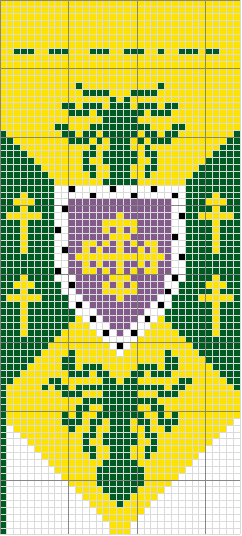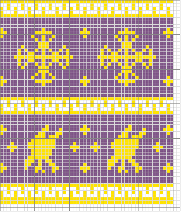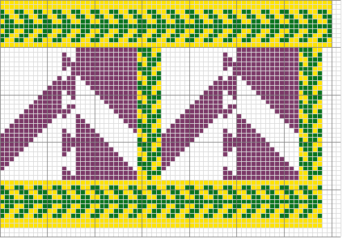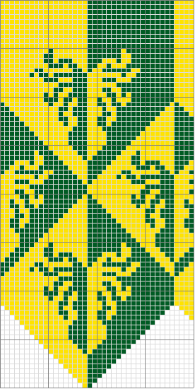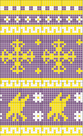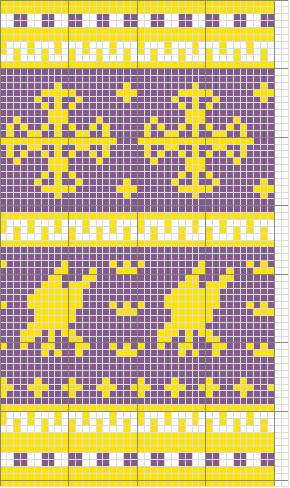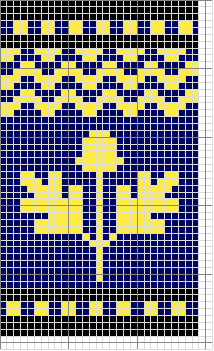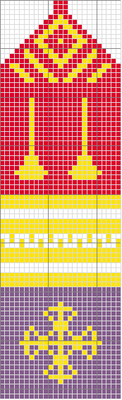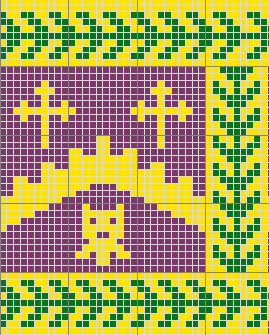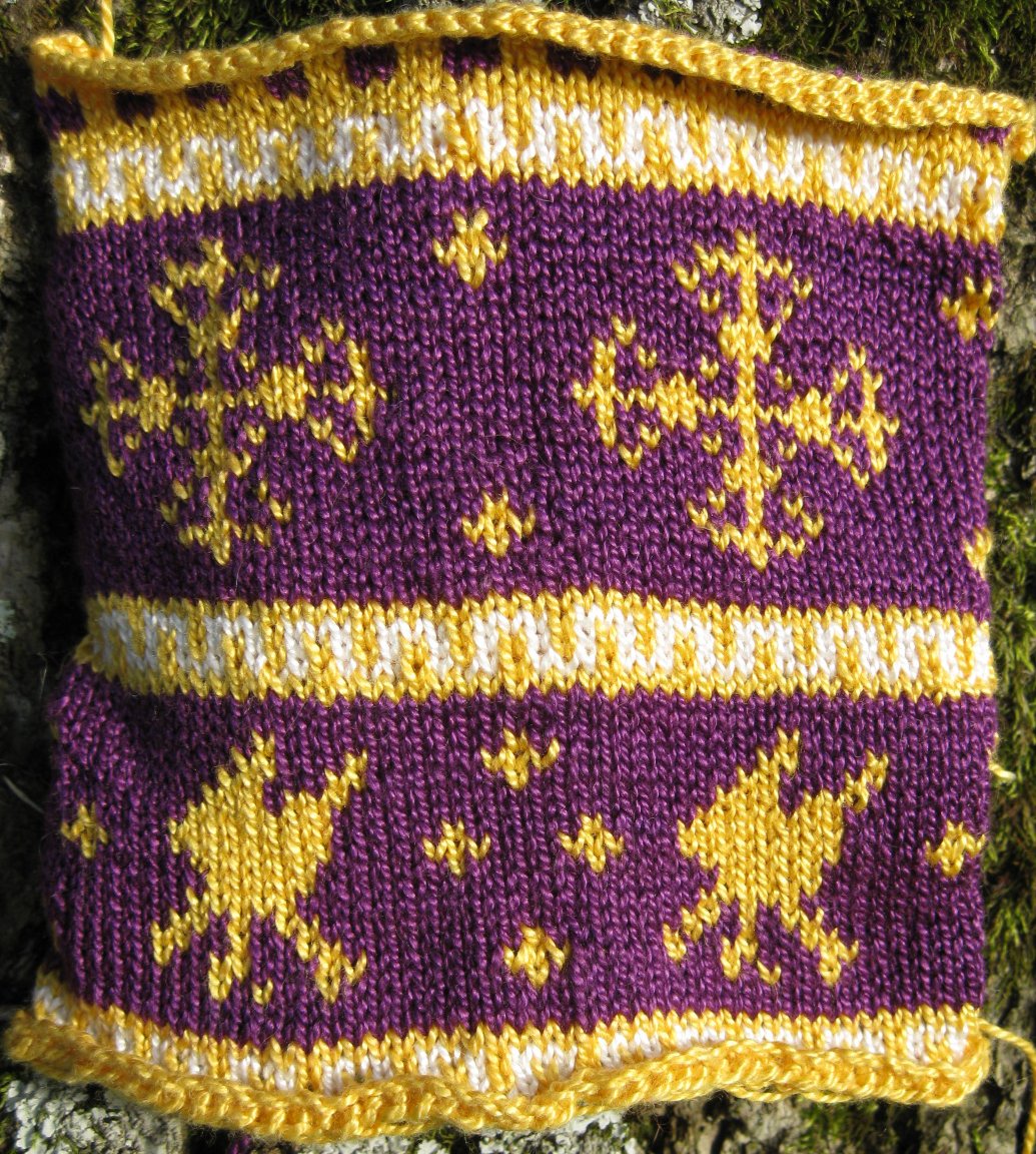 Notes: simple two-color stranded work, nothing too challenging. I decided that the pattern needed some tweaking - too much empty background between the motifs, the lines of the crosses needed to be beefed up a bit and I got the pattern of the falcon's heads wrong. In addition, the little fleur-de-lis would have looked more like fleur-de-lis if I had knitted from the top down.