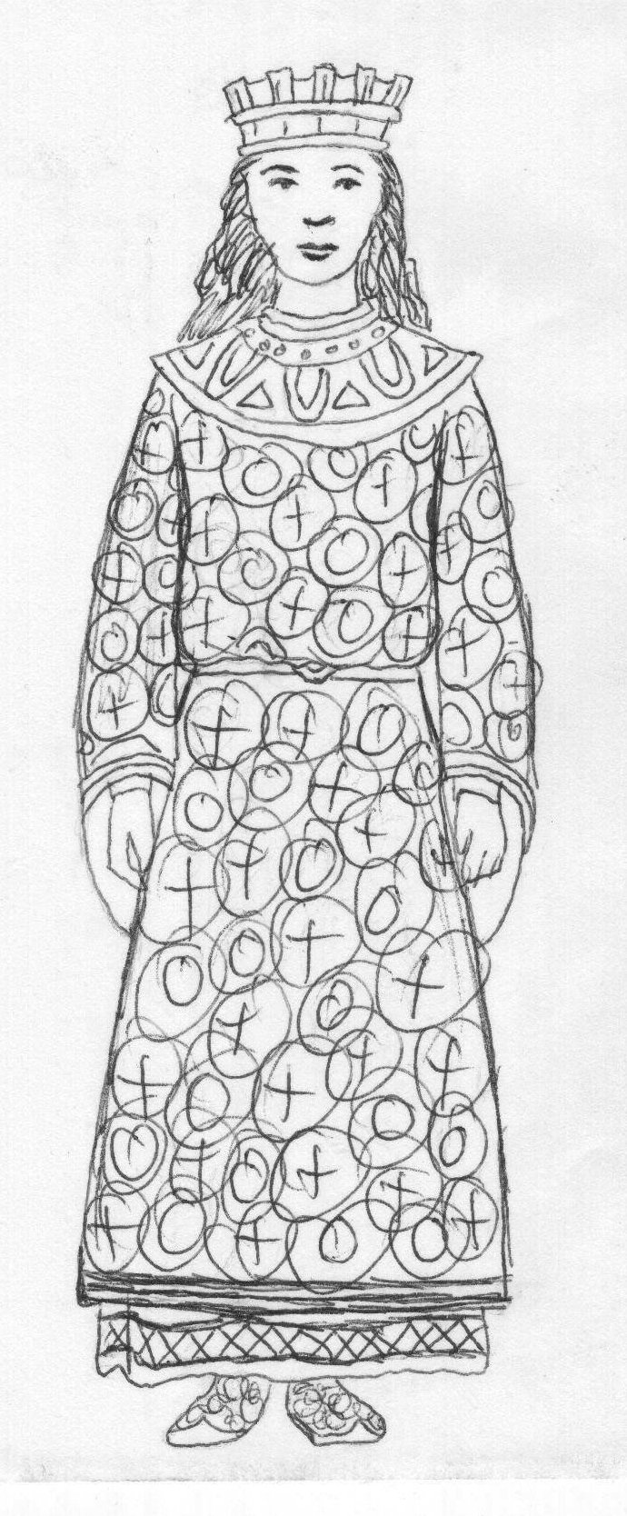 hair. The rest of her royal ceremonial costume consists of a long-sleeved