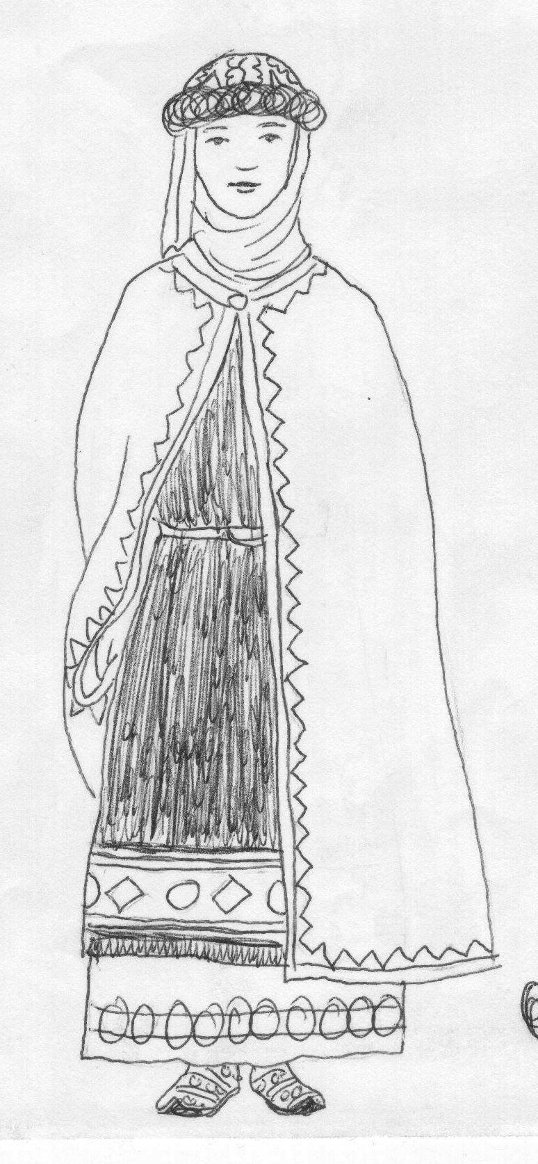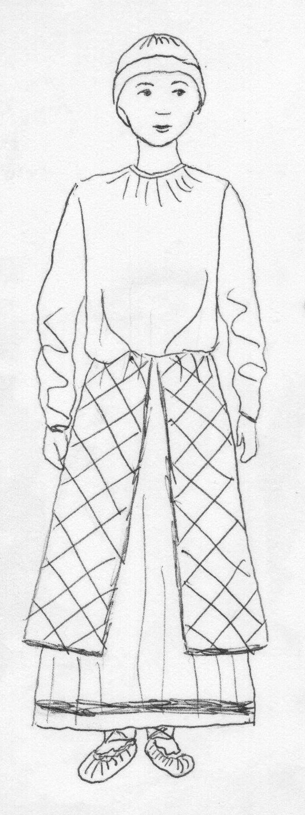 back under a venets, a belted and pinned zapona over a rubakha and she is