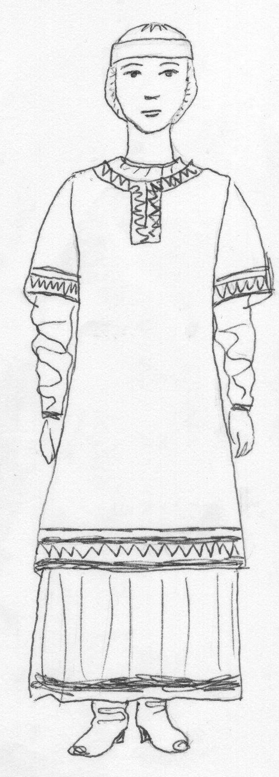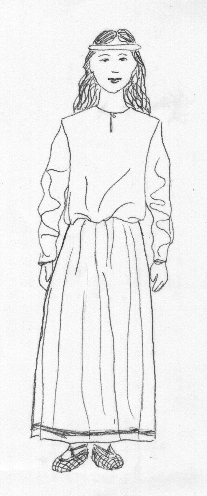 wearing a belted rubakha. She is also wearing lapti on her feet.