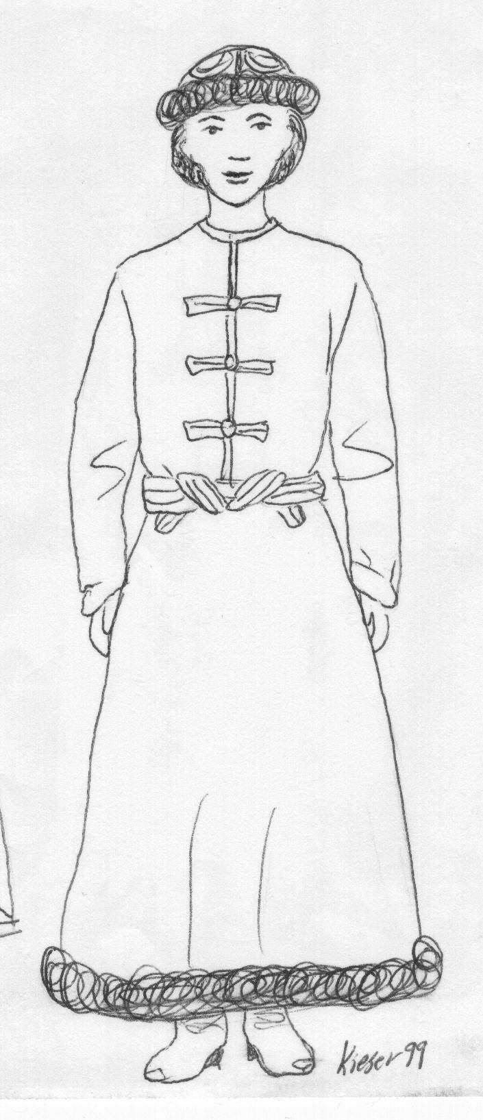 This unmarried maiden is wearing a fur-lined hat over her braided hair. She