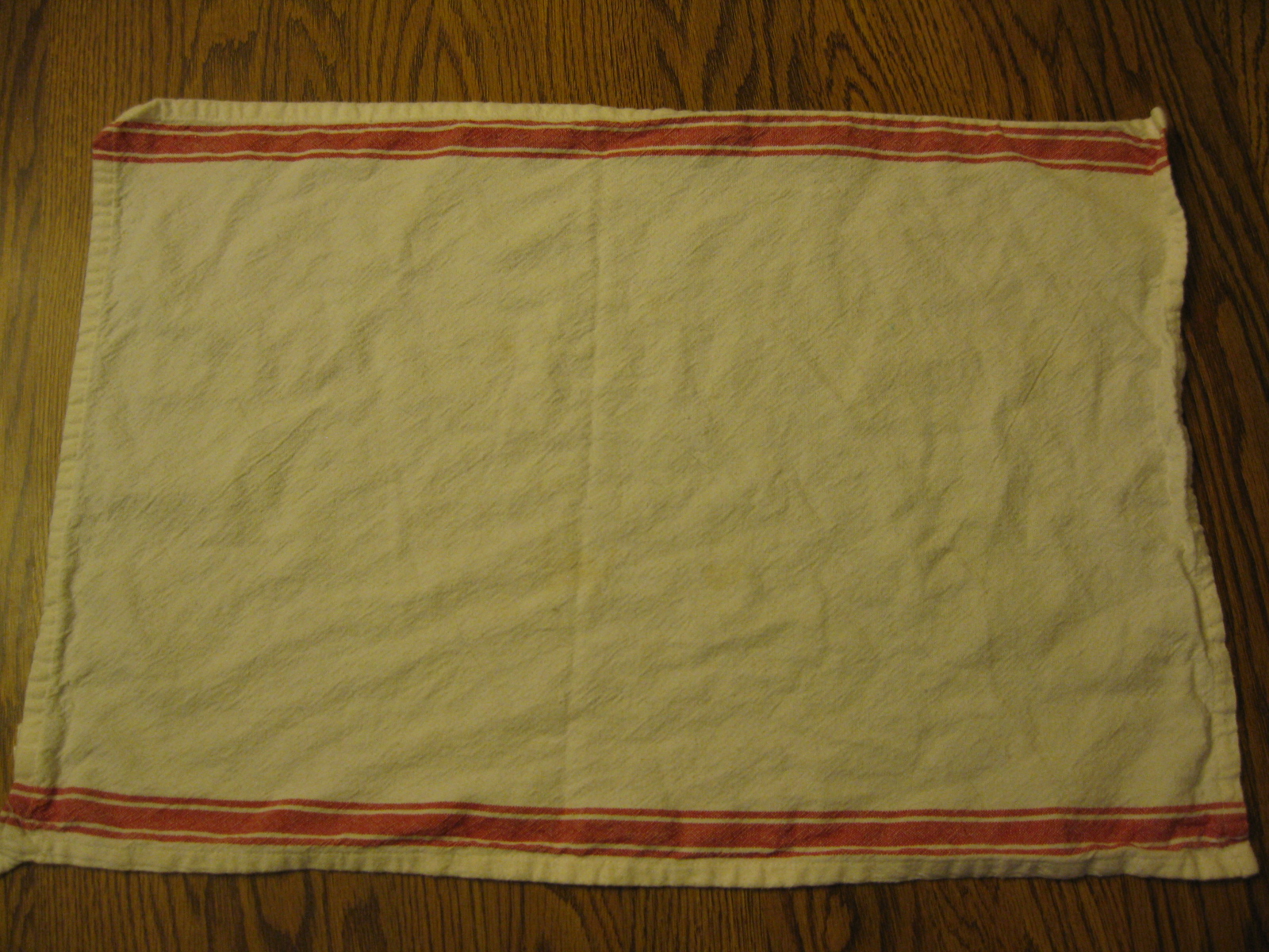 This towel happens to be a little too small to stay secure. You could tie a piece of card-woven trim or embroidered ribbon around where the red stripe is for extra security and decoration.