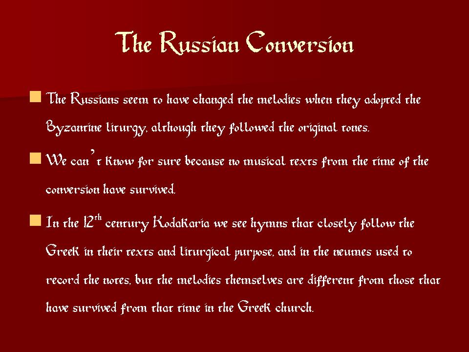 Medieval Russian Music ClassUpdated 17 November 2013 Unfortunately, I haven't yet figured out how to link in the music clips from the original PowerPoint presenation. These days, you can probably find them for yourself if you "Google" the songs. Many came from samples at Musica Russica