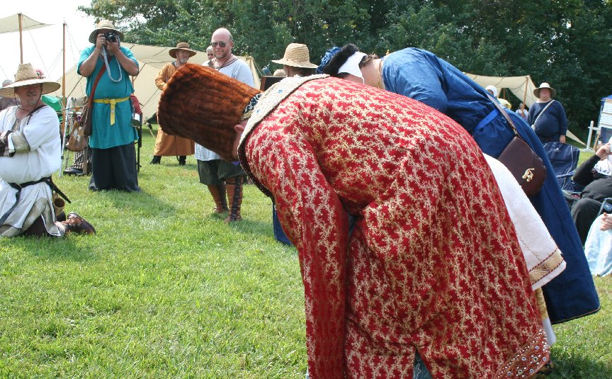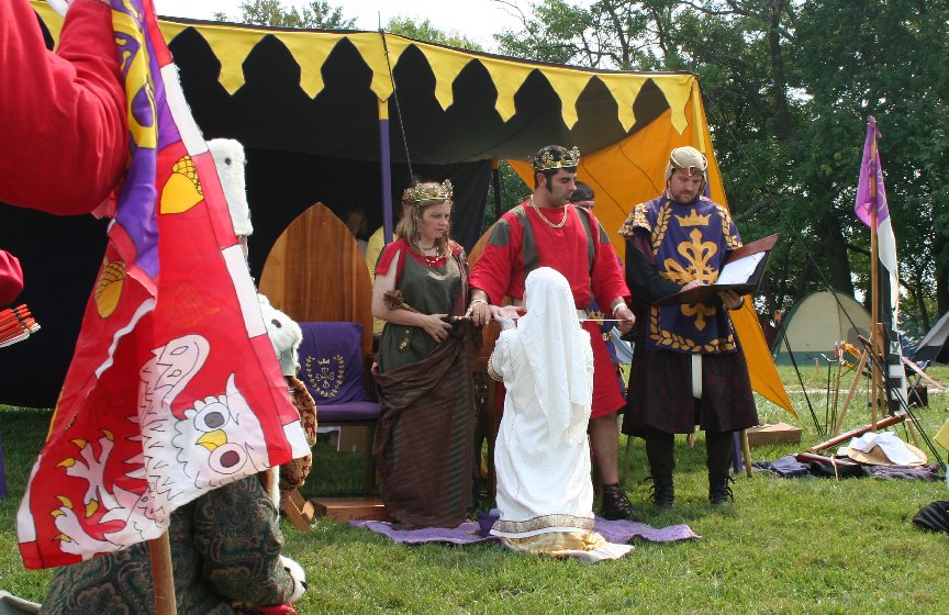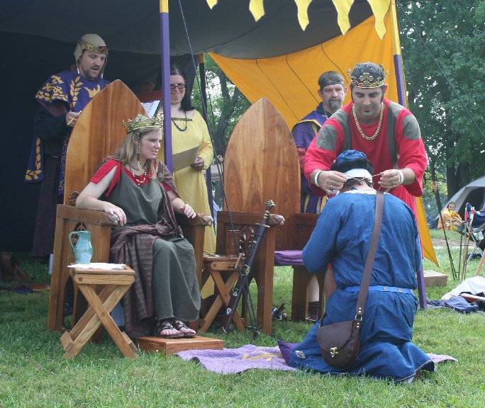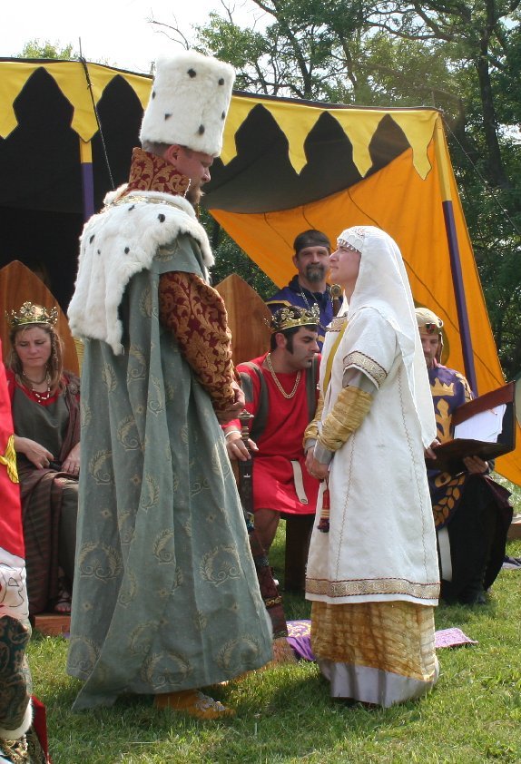 King: Accept from Our Hand that which your skills and devotion has brought to you. King: May your skills ever be increased and offered in service to Calontir and the Society. Queen: May your comportment ever serve as an example of gentle courtesy and humility. Crown: And may your spirit forever follow after the goals your heart has set before you. King: We would be pleased to accept your fealty at this time.