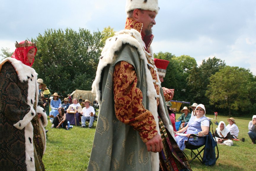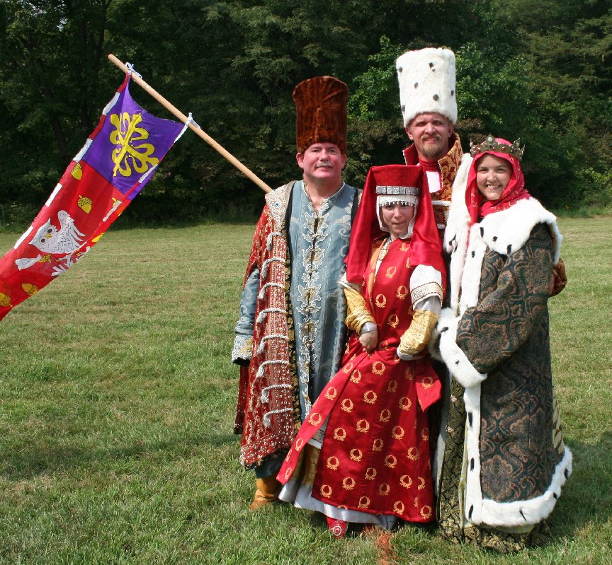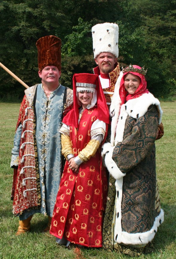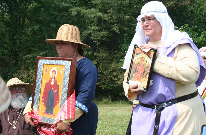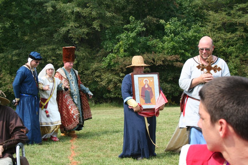 The format of a Peerage ceremony in Calontir is pretty fixed. The only places to individualize are in the procession, the wording of the oath of fealty, and the scroll text. Most people swear a standard oath of fealty, but I took the opportunity to make mine as Russian as possible, based on period Russian loyalty certificates. This all presented a special challenge to the Herald, HE Baron Michael of Lonely Tower (aka Sir Michael Nymandus von Falkenburg) who had to say my Russian name and read the arcane text of my scroll. He did a really good job. Russian processions are traditionally led by a cross followed by the appropriate icons and banners. In the medieval Russian coronation ceremony, the claimant to the throne was supported under each arm. Bells were rung to mark all special occasions. My procession was led by a gorgeous wooden Cross of Calatrava made by my household sister Mistress Tatjana Nikonovna and carried by Lord William Fletcher of Carbery (who went on to win his class in the archery tournament that day). HL Brigida von Muenchen carried my painting of the Virgin Orans and Lady Juliana MacNayre carried an icon of Svataya Sofiya (the Holy Wisdom), my name saint. I was supported by my husband, Lord Sifrid von Eichelborn and Master Mordak Timofeevich Rostovskogo. Master Mordak drove all the way from Ohio to attend the ceremony. He discovered my webpage when I was just a newbie in the Slavic Interest Group and he's been a constant encouragement ever since. So it was very appropriate that he help escort me into court. To bring up the rear of the procession, Lady Royse Meingnes rang a brass bell and Lord Berndt der Kuehne carried the silk banner that Master Mikhail had made for me.