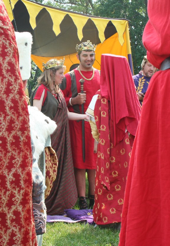 And we, gospoda Martino and Ariel of all Calontir, give esmi to this certificate after signature and sealed up this authentic certificate by our seal. And to the certificate the grand prince and the grand princess ordered their clerks hands to apply and to this certificate clerk hand applied, and directory clerk hand applied. And such is given award certificate in Loch Smythe in the month of September the 12th day, of the year 6817, A.S. 44. Queen: Good Laurels, please escort your newest member from our court.