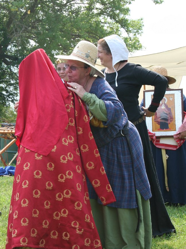 Master Thorkell: (own words) Queen: Bring forth the cloak (made by Mistress Vasilla with fabric from Mistress Tatjana). Mikhail:
