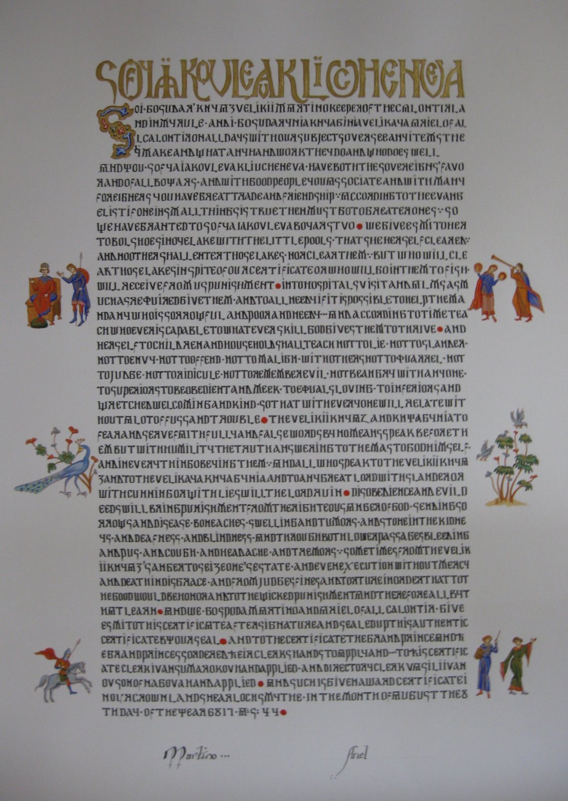 So I, gosudar’ knyaz velikii Martino keeper of the Calontir land in my rule, and I, gosudarynia knyaginia velikaya Ariel of all Calontir on all days with our subjects oversee any items they make and what any handwork they do and who does well. And you, Sofya Iakovleva Kliucheneva, have both the sovereigns' favor and of all boyars, and with good people you associate and with many foreigners you have great trade and friendship. According to the Evangelist if one in small things is true then must go to greater ones. So we have granted to Sofya Iakovleva boyarstvo. We give esmi to her to Bolshoe Sinoye Lake with the little pools, that she herself cleared. And no other shall enter those lakes, nor clear them. But who will clear those lakes in spite of our certificate or who will go in them to fish, will receive from us punishment Into hospitals visit and alms as much as required give them, and to all needy if it is possible to help them and any who is sorrowful and poor and needy... and according to time teach whoever is capable to whatever skill God gives them to thrive. And herself to children and household shall teach not to lie, not to slander, not to envy, not to offend, not to malign, with others not to quarrel, not to judge, not to ridicule, not to remember evil, not be angry with anyone, to superiors to be obedient and meek, to equals loving, to inferiors and wretched welcoming and kind, so that with everyone will relate without a lot of fuss and trouble. The velikii knyaz and knyagynia to fear and serve faithfully and false words by no means speak before them but with humility the truth answering to them as to God himself, and in everything obeying them. And all who speak to the velikii knyaz and to the velikaya knyagynia and to any great lord with slander or with cunning or with lies will the Lord ruin.